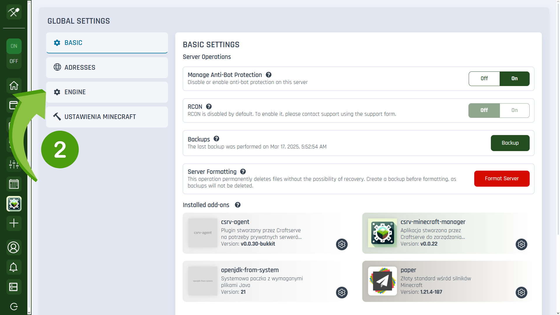 To use Anti-Xray without the need to install additional plugins, you need to install the Paper engine or its forks (such as Purpur) on your server and select your server version. To do this on the Craftserve hosting platform, go to the Settings tab in the Main Panel, then select Engine. From the list of engines, choose the one you need and click Install.