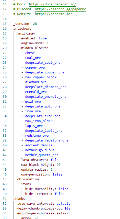 To enable Anti-Xray, simply copy and paste the following settings into the appropriate files.
