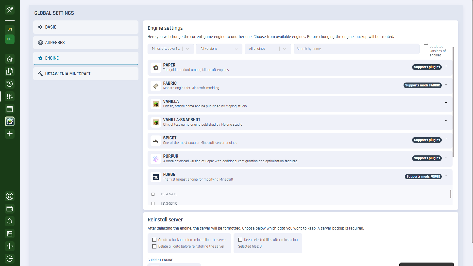 You can set the Forge engine in the Settings -> Engine -> Forge tab in the Craftserve panel.