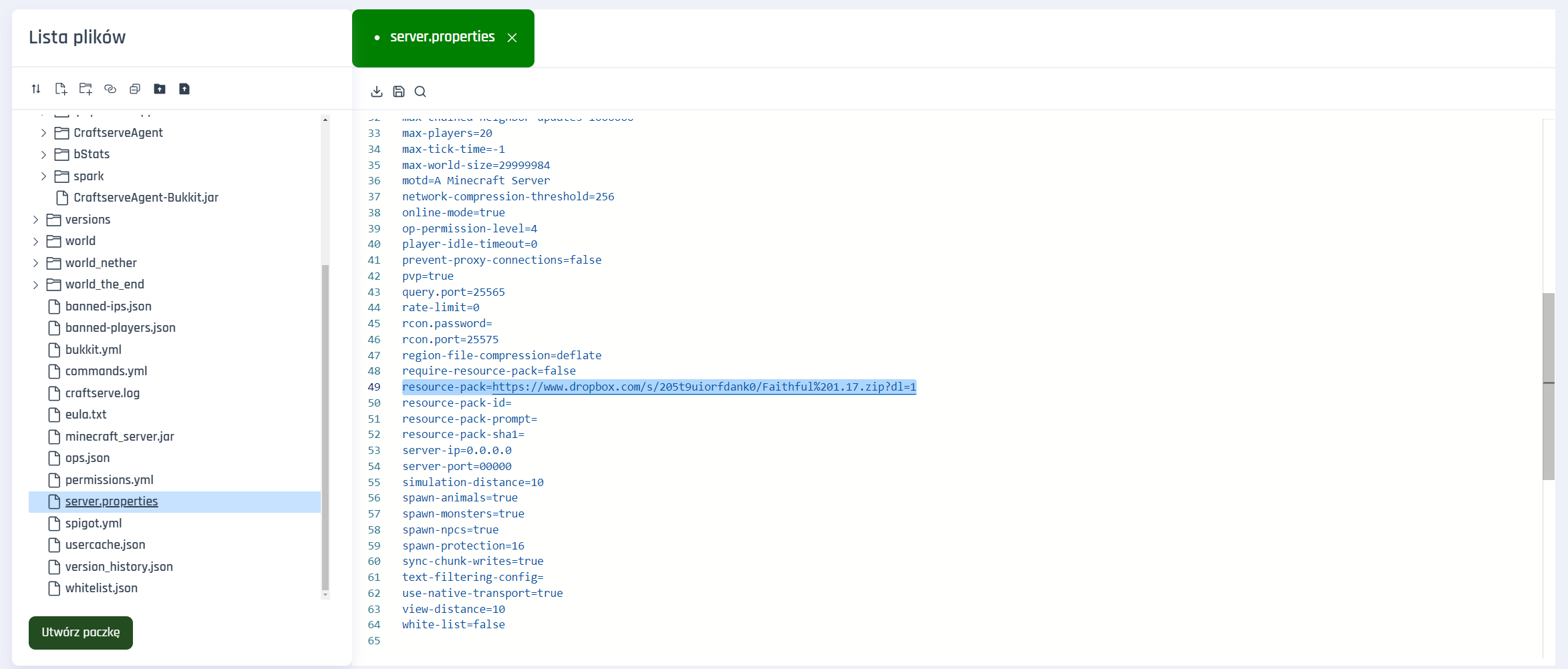 Once you have the link, go to the server file server.properties. This file is located in the main directory of your server. Look for the line resource-pack= and paste the link there.