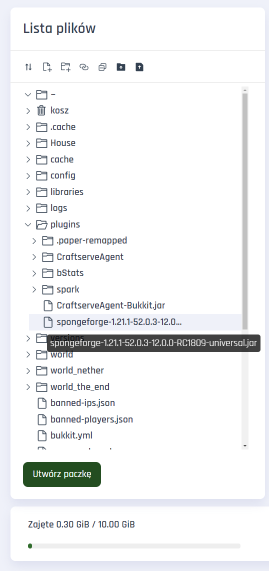 You can manage files through the Files tab in the Craftserve panel or using the FTP protocol with an FTP client, such as FileZilla.