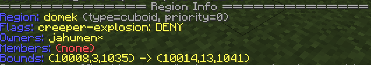 After creating the region, players will automatically be unable to perform any unwanted actions, including editing blocks, opening chests, doors, riding animals, minecarts, etc., within the region. By default, only the administration with the appropriate permissions and players added as members or owners can modify the region.