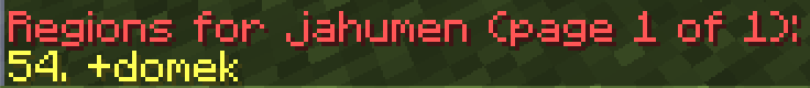 /rg list [-p player] [page]- This command will display a list of all regions. It supports the-p playerflag (e.g.,/rg list -p jahumen), which allows checking the list of regions a specific player is added to.