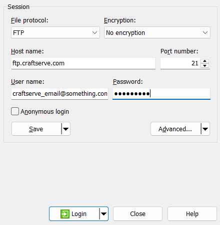 - Enter Host name: ftp.craftserve.com