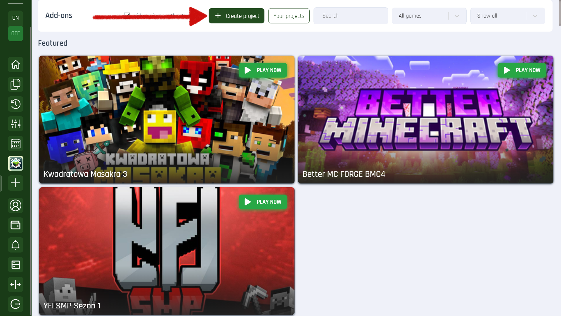 1. Go to the server management panel, then to the Addons Gallery, and click the “Create Project” link¶