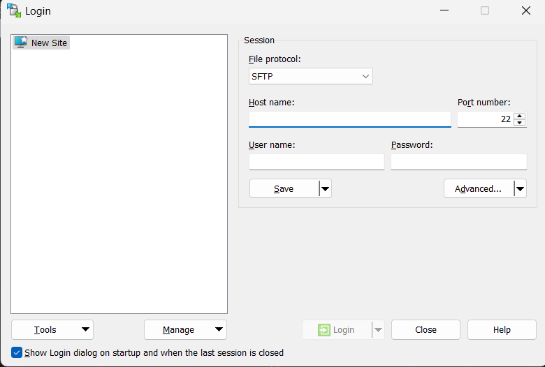 - Open WinSCP and choose New Session/New tab.