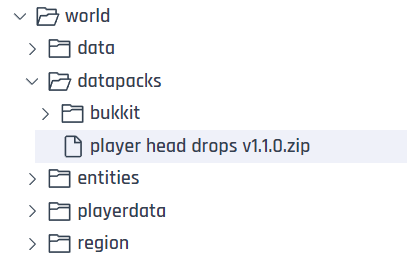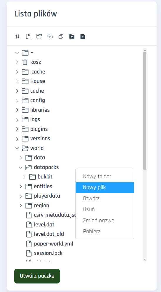 Następnie w plikach serwera otwieramy folder world, a w nim folder datapacks. Tam wgrywamy nasze datapacki w formacie .zip. Żeby to zrobić, należy nacisnąć przycisk Plik z zakładki Wgraj pliki.