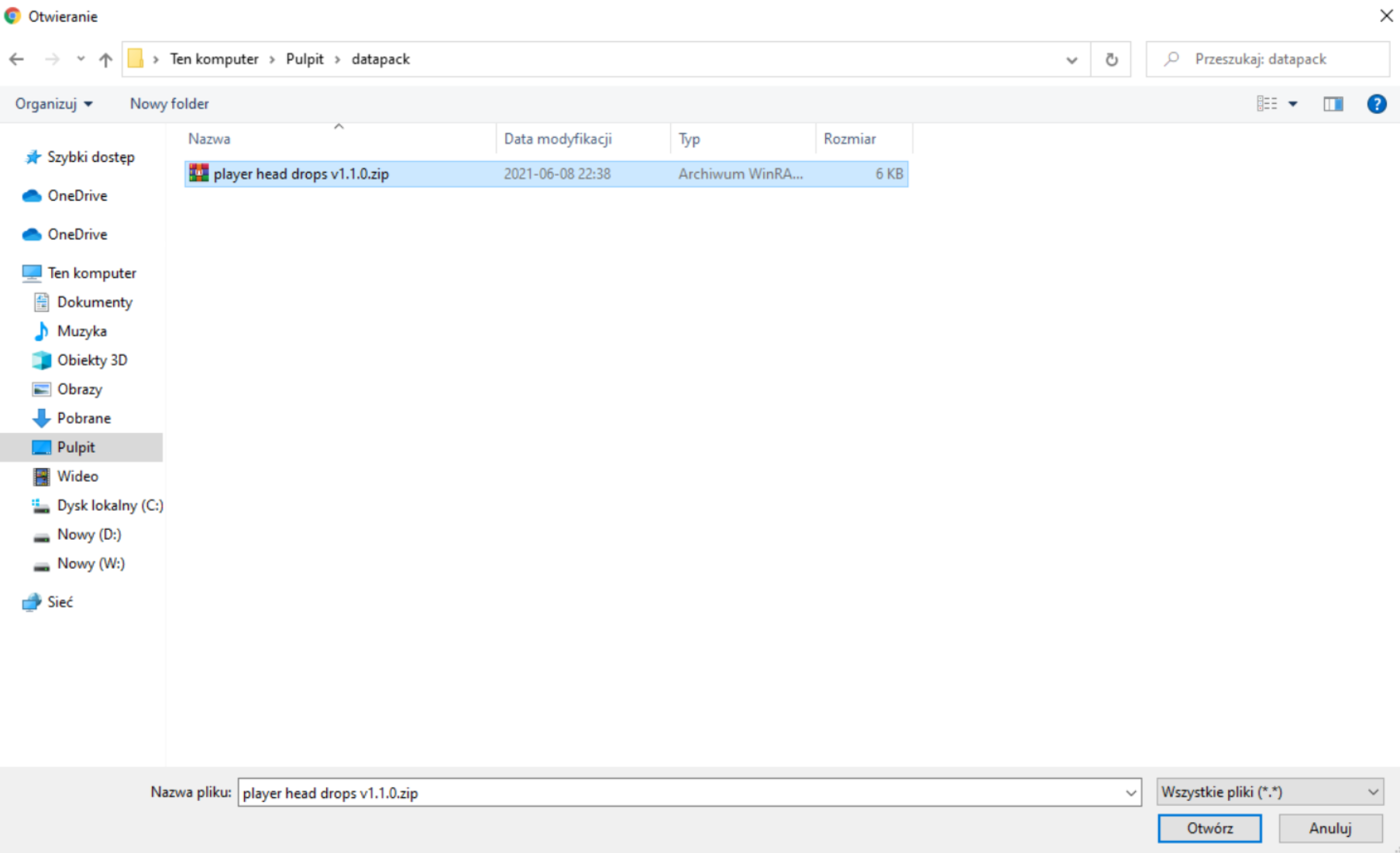 Następnie wybieramy naszego datapacka i klikamy otwórz.