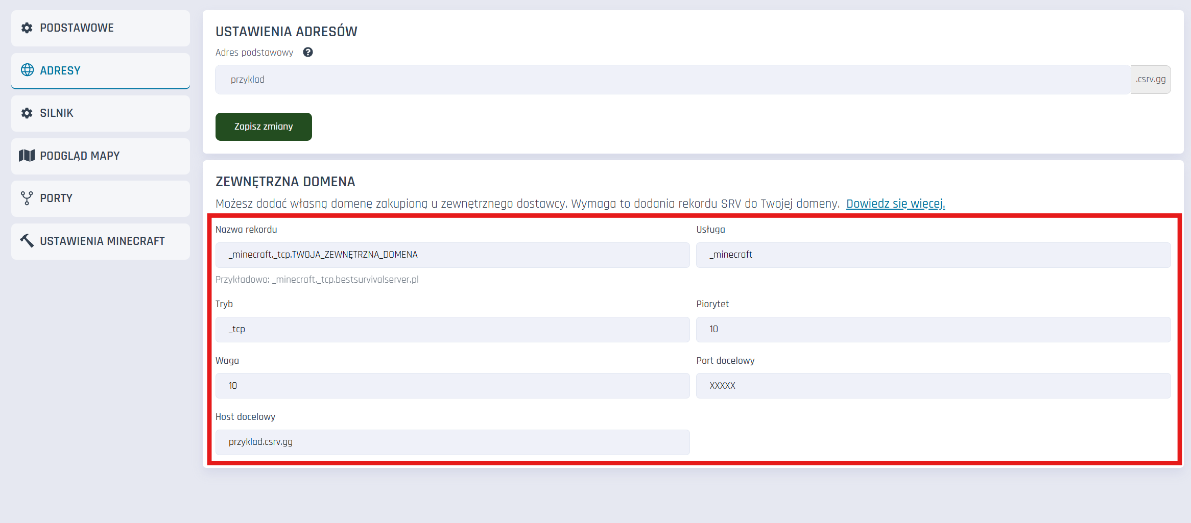 Dane do uzupełnienia skopiuj z panelu Craftserve, konkretnie z zakładki Ustawienia -> Adresy -> Zewnętrzna domena. Wygląda ona następująco: