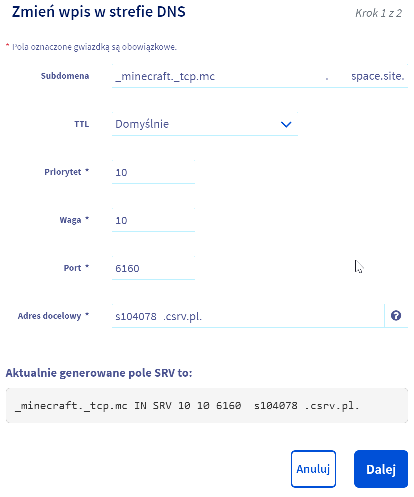 W polu subdomena/nazwa należy wpisać nazwę subdomeny na której ma być dostępny serwer. Jeśli chcemy aby serwer działał na domenie głównej, należy pozostawić to pole z wartością _minecraft._tcp.domena.pl (czasem końcówka jest dopisywana automatycznie).