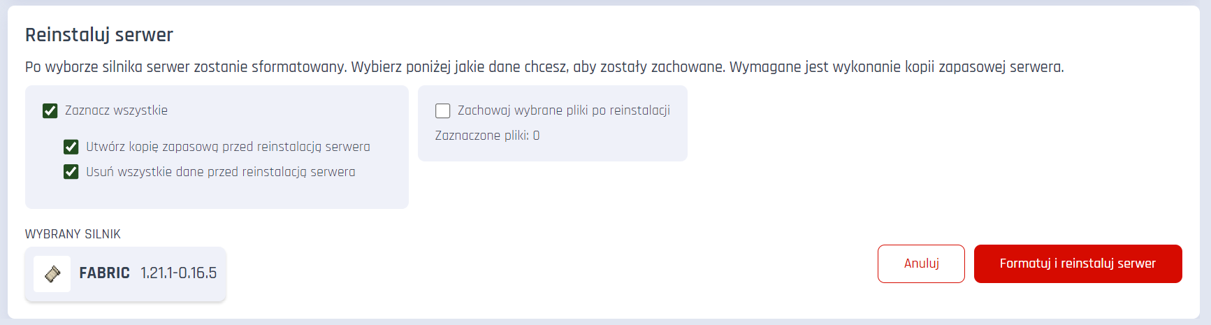Uwaga: Formatowanie serwera spowoduje utratę wszystkich plików, w tym wszystkich elementów zapisanych na mapie.
