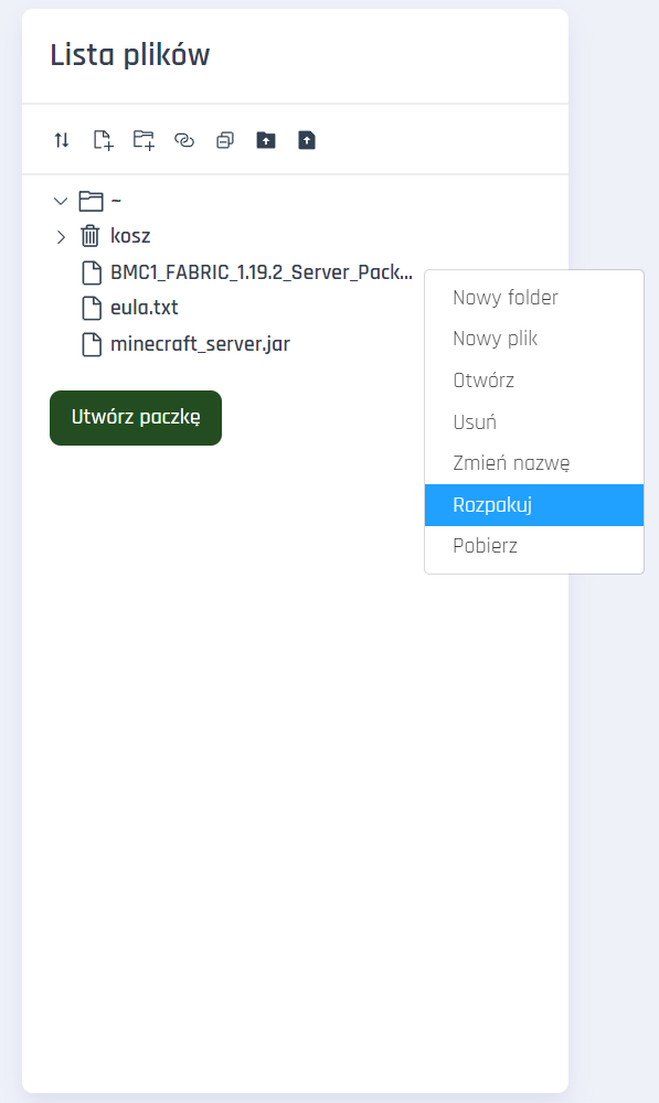 5. Odszukaj wgrany plik zip i kliknij na niego prawym przyciskiem myszy. Z listy wybierz opcję Rozpakuj.