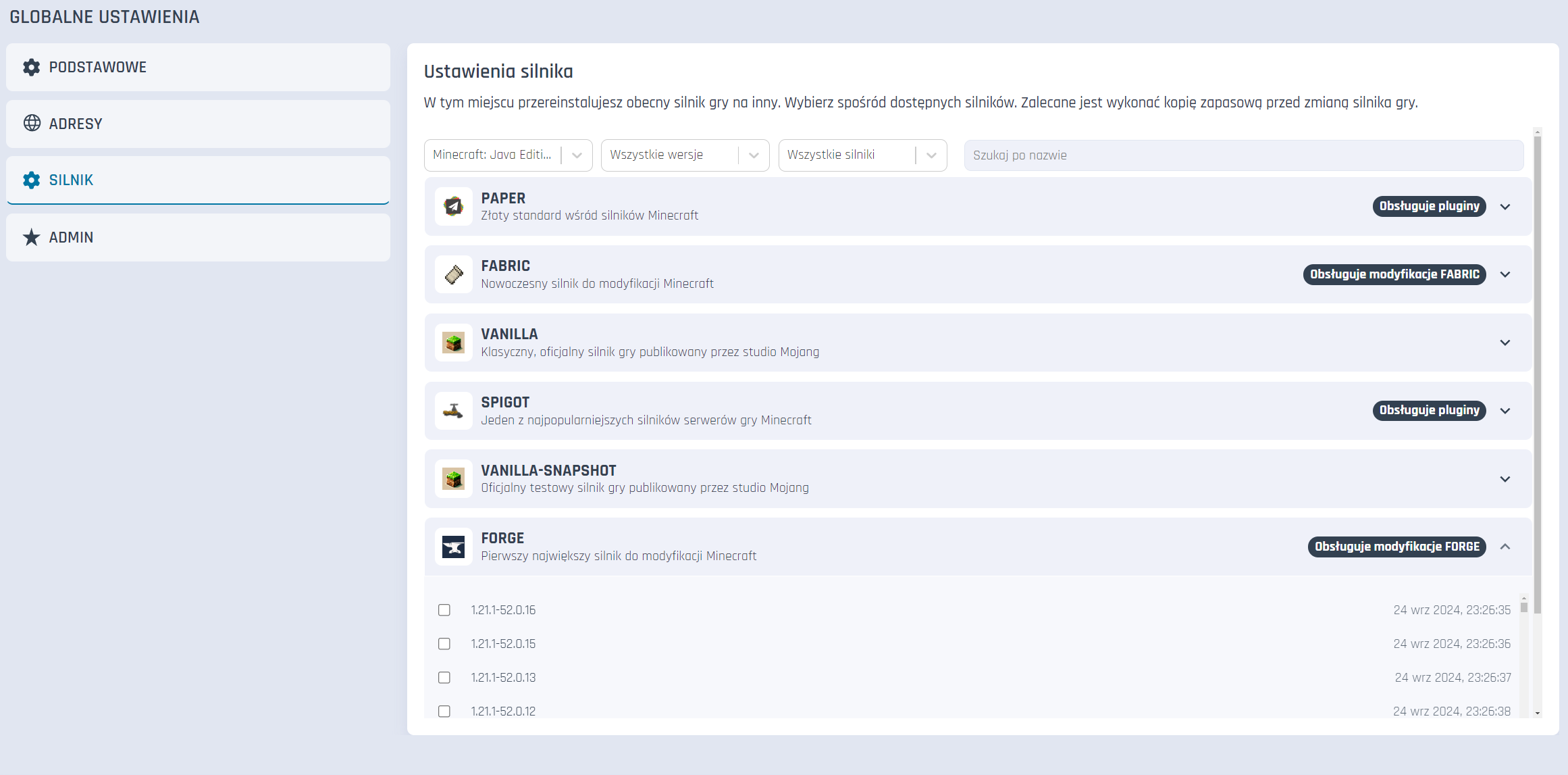 Silnik Forge możesz ustawić w zakładce Ustawienia -> Silnik -> Forge panelu Craftserve.