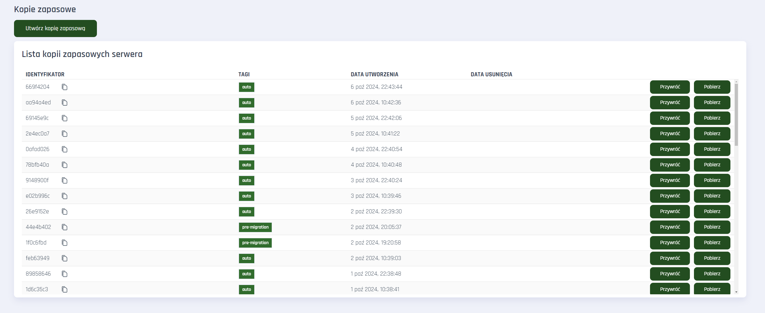 Backupy tworzą się automatycznie co jakiś czas oraz w określonych przypadkach, na przykład przed wykonaniem formatowania serwera, przywróceniem innej kopii, migracji na inną maszynę, i nie tylko.