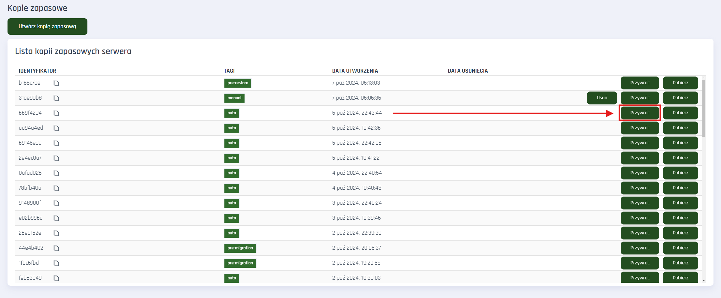 - Gdy już wiesz, którą kopię przywrócić, po prostu kliknij przycisk Przywróć po prawej stronie. Zostanie wykonana automatyczna kopia przed przywróceniem, a następnie wgrany zostanie wybrany backup.