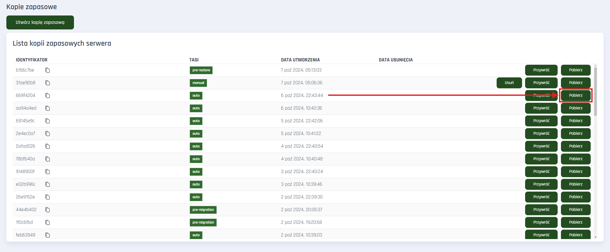 - Ustal z jakiej daty i godziny potrzebujesz backupu. Kiedy doszło do griefu na serwerze? Kiedy zostały uszkodzone pliki? Spójrz na listę dostępnych kopii i wybierz tę, która Ci odpowiada. Jeśli nie wiesz, możesz spróbować kilka. Wtedy przywracaj po 1 kopii, sprawdzaj czy to ta właściwa, a jeśli nie, powtórz to z następną.