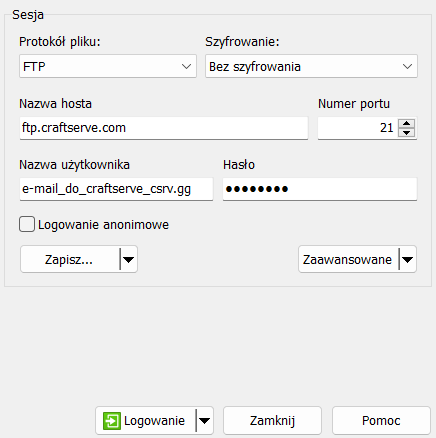 - Wpisać w Nazwa hosta: ftp.craftserve.com